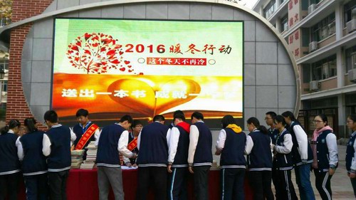 11月28日,郑州五中文明办、校团委学雷锋志愿服务队联合启动了“2016暖冬行动”,关爱留守儿童,为结对帮扶单位荥阳市城关镇桃李乡村小学举行爱心捐书。中午,启动仪式在校园广场电子显示前和明德楼一楼明厅楼梯旁同时开始,让留守儿童“冬天有书不孤单,孩子读书更幸福”。