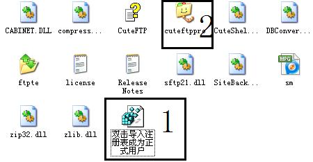 3、双击1处的注册文件,完成注册,然后右键点击cuteftppro图标,发送桌面快捷方式。