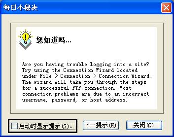 1、到桌面双击 cuteftppro的图标,出现下图,去掉“启东时显示提示”前的对勾。