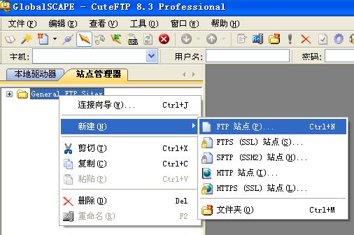 2、出现下图后,右键“站点管理器”——“General FTP sites”——“新建”——“FTP站点”
