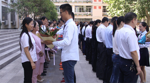 开幕式气氛十分热烈,在三位主持人的带领下,同学们的“敬爱的班主任老师,您辛苦了!”的祝福声回荡在校园上空,随后各班一名学生代表向班主任老师拥抱、献花并合影留念,留下美好的瞬间。