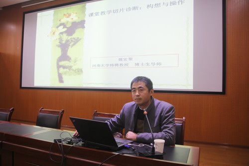 报告会上,魏宏聚教授从“课堂教学切片诊断方法提出的初衷与内涵”、“课堂教学切片诊断的操作与步骤”两大方面进行论述,借助政治课堂教学中时政播报与情境导入设计和理科演示实验课的操作规律等课例,以观看录像和切片诊断横断分析等形式,让与会老师身临其境地熟悉并掌握了课堂教学切片诊断的操作与步骤等方法。
