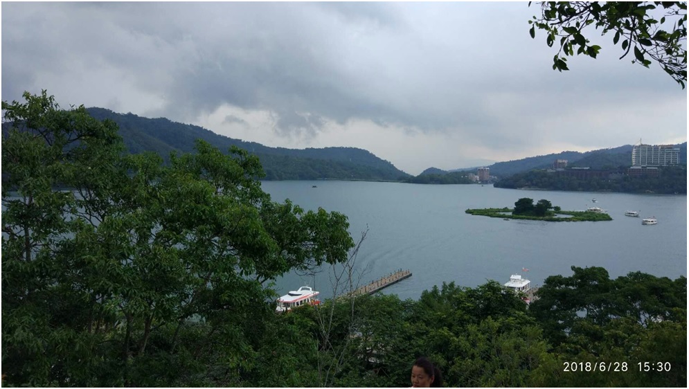 6.28 下午我们拜访了美丽的日月潭。坐上宽敞的游艇,横穿过闪着粼粼波光的深潭,听那位邵族的大哥慢慢讲日月潭的传说。日月潭是由山脉断裂形成盆地,再由长期积水形成的淡水湖,潭深处可达30米。船只向湖心驶去,很快一个小岛出现在眼前。